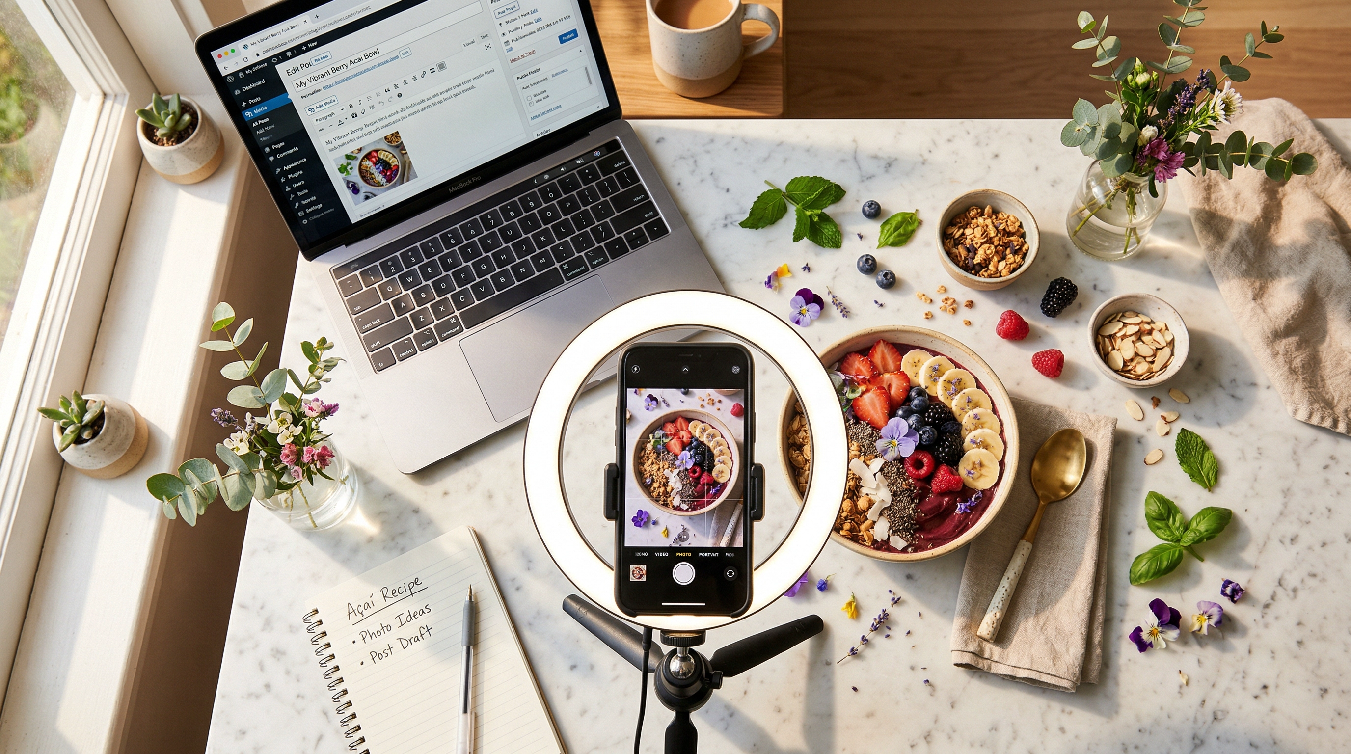 - A window. Natural light is the best lighting for food photography. No ring light needed yet.